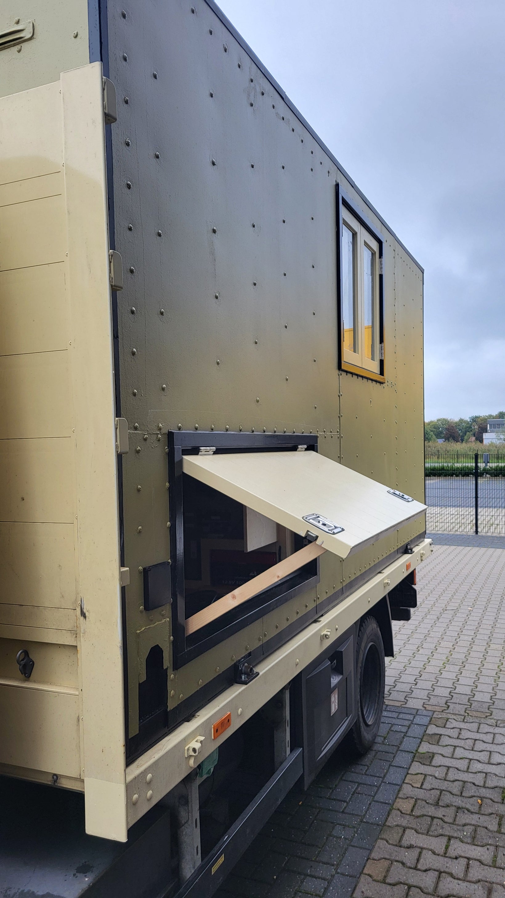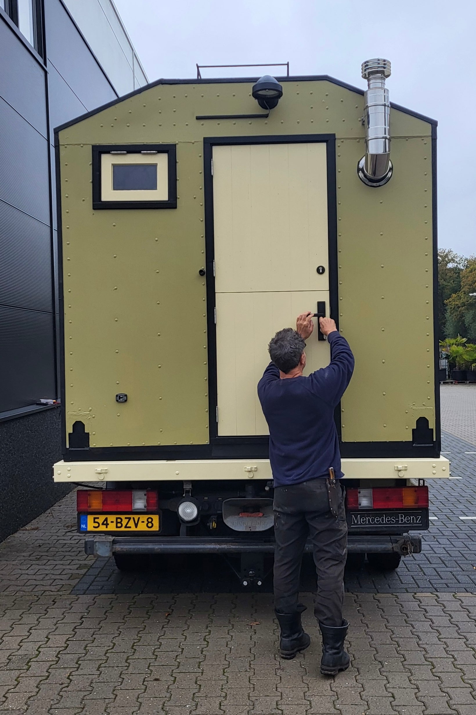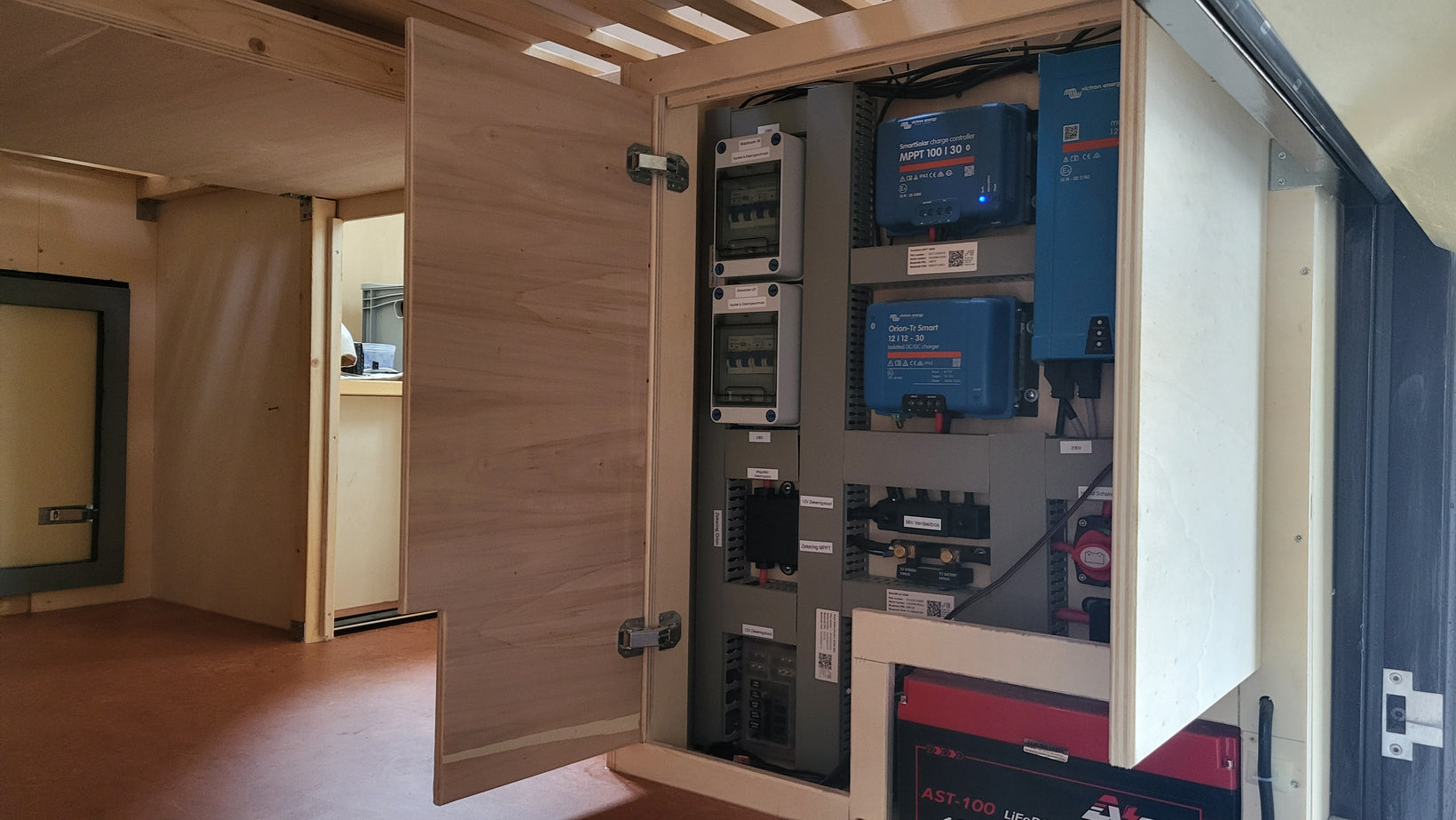 De camper heeft een losse woonunit die op en van de vrachtwagen kan worden gehaald. Roderik wilde een compacte, overzichtelijke elektra oplossing die eenvoudig kon worden aangesloten.