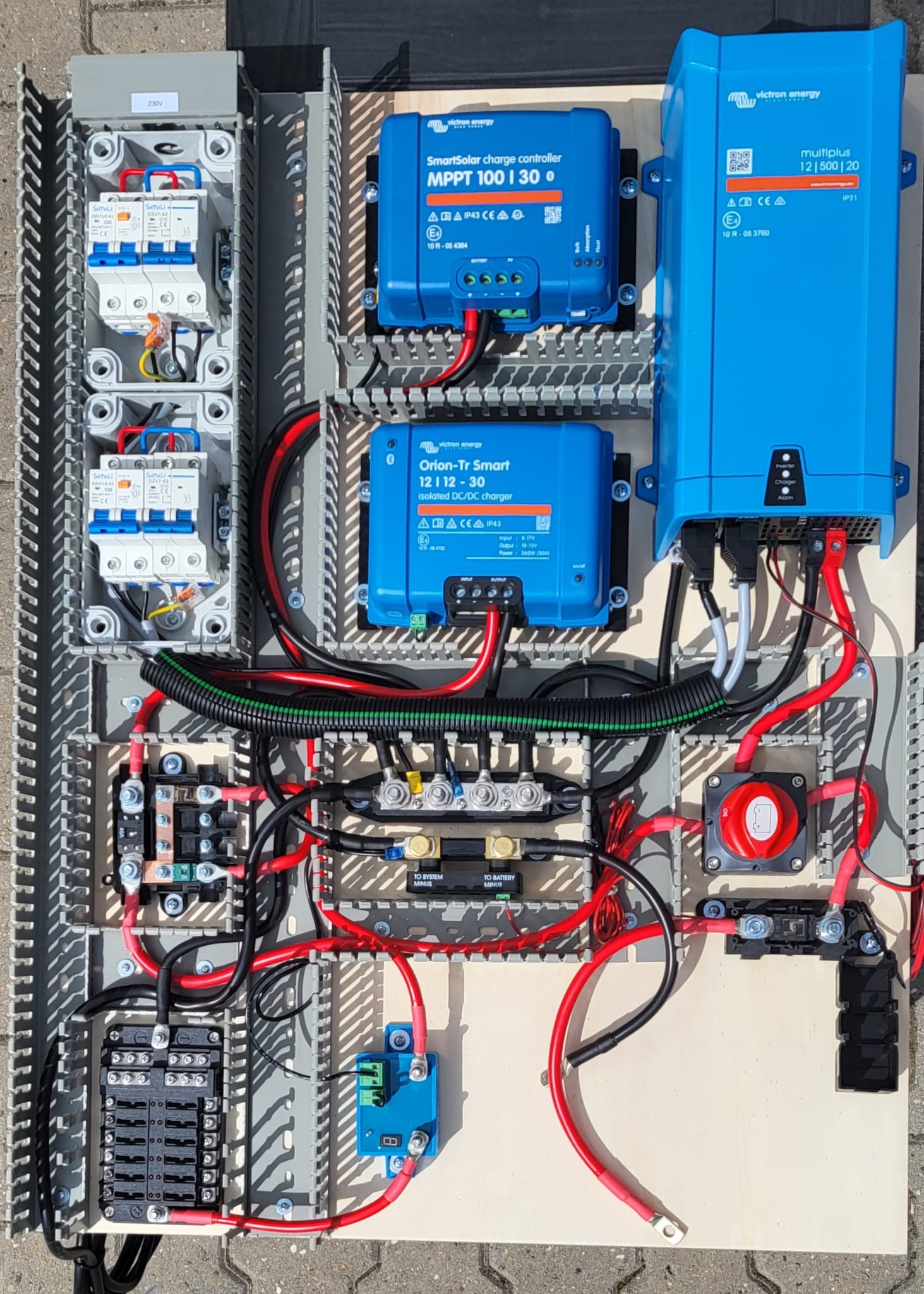 Daarnaast bevat het systeem een kleine omvormer (Victron Multiplus 12/500) voor licht 230V-gebruik — ideaal voor laptop, gereedschap of kleine apparaten.