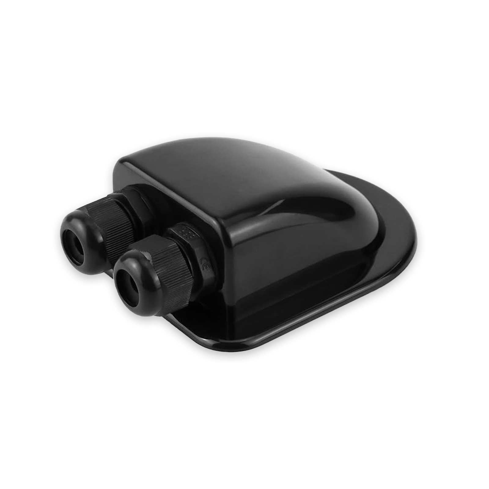 De zwarte kunststof dubbele dakdoorvoer die geschikt is om een plus- en minkabel van één of meerdere zonnepanelen naar binnen te geleiden.